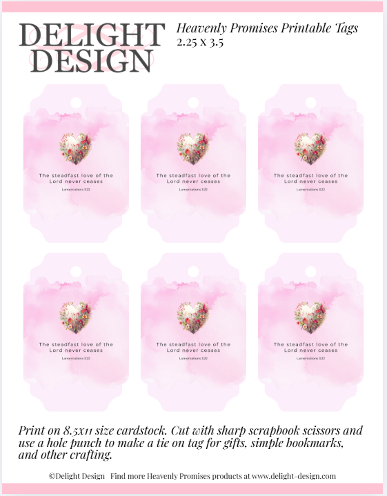 These 2.25 x 3.5 inch scripture art tags are designed to add a thoughtful, faith-filled touch to gifts, baskets, and handmade items. Each tag features a soft scalloped edge on the top and bottom and includes hole placement for easy punching and tying.
